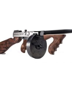 The “Trump Thompson” starts as a Model 1927 Tommy Gun, chambered in .45 ACP. It is entirely manufactured in the USA from quality steel and American walnut. On the right side is engraved an American flag, and the image of our 45th President. His name and 45th are engraved on the receiver. The grip contains his famous quote drawing the line at infringing on Americans’ rights. On the right stock are engraved the Presidential Seal, American Flag, and the White House. The grip contains another important quote from President Trump defining the Second Amendment as America’s “first freedom”. The receiver contains President Trump’s promise to “Make America Great Again”. The finish is highly durable Cerakote in Armor Black, and Cerakote Clear over high polished flats.