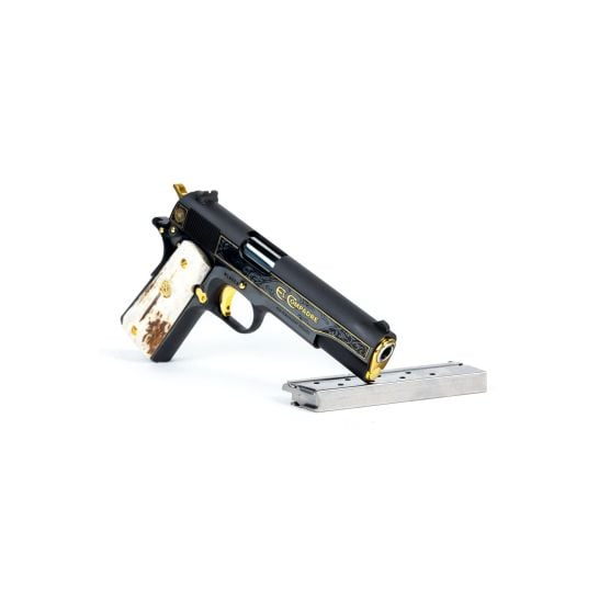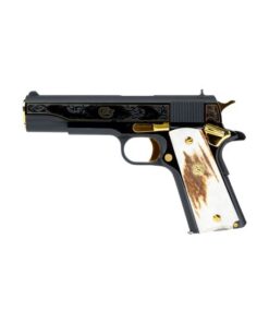 The Colt 1911 El Compadre Limited Edition with only 500 made the is crafted with precision and passion, this iconic handgun boasts a 9+1 capacity, ensuring you’re always ready for action. With a 5-inch rifled barrel and an overall length of 8.5 inches, it strikes the perfect balance between accuracy and maneuverability. Safety is paramount, featuring both thumb and grip safety mechanisms, granting you peace of mind in any situation. Adorned with exquisite scroll engraving and gold inlays, this masterpiece stands out from the crowd. The steel frame finished in classic blue exudes elegance and durability, while the blade front sight and fixed rear sight guarantee pinpoint accuracy. Weighing 35 ounces, it’s light enough for extended use without sacrificing control. The service hammer and flat mainspring housing further enhance its performance and handling. Trust in the Colt 1911 El Compadre to deliver unparalleled reliability and precision with every shot, making it the ultimate choice for discerning shooters.