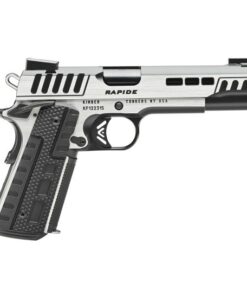 The RAPIDE (SCORPIUS) (DN,NS) is a one-of-a-kind 1911 designed for both performance and aesthetics. Featuring stepped cocking serrations and slide lightening cuts, it ensures faster slide lock-up, enhancing the pistol’s speed and reliability. The DLC-coated barrel offers exceptional durability, capable of withstanding heavy use while maintaining peak performance. Equipped with Kimber Stiplex front strap stippling, it provides a secure and confident grip, while the Black G10 Rapide patterned grips add an extra layer of control and comfort during handling. The KimPro Black finish, combined with brush-polished flats, gives the RAPIDE (SCORPIUS) a striking and sophisticated appearance that stands out in both form and function.