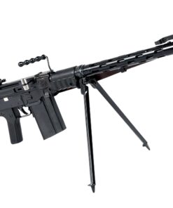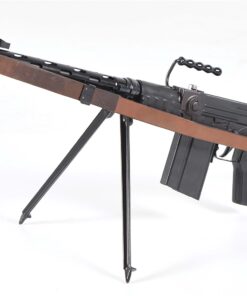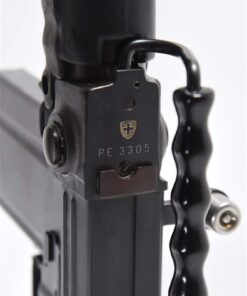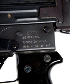 Model PE57 semi-automatic rifle manufactured by SIG for commercial sales. Based off the Sturmgewehr 57 that was adopted by the Swiss military, the PE57 semi-automatic rifle was imported into the USA in extremely limited numbers during the 1980s, largely owing to its scarcity and desirability among collectors today. This example bears the Swiss cross within a shield above the serial number PE 3305″ over the top of the chamber, with Swiss proofs stamped on the right. The left side of the trigger housing is stamped “3305/ SIGARMS INC./ Tysons Corner.VA/ Made in Switzerland”. Selector is marked “S” in white and “1” in red. Top of stock socket is stamped with the encircled “SIG” logo. Features include a stamped steel construction, precision cast barrel trunnion, roller-delayed bolt, gray phosphate finish, 24″ barrel with integral muzzle brake, bayonet lug, ventilated barrel shroud, flip-up sights reminiscent of the German FG-42, “T” shaped charging handle, serrated polymer pistol grip, fold-up rubberized buttstock & forend, as well as a brown leather sling. Matching numbers are present on the receiver, barrel shroud, trigger housing, stock socket, as well as the bolt assembly. Complete with test target, SIG manual, and Swiss Army manual. PROVENANCE: From the collection of esteemed NFA firearms enthusiast and collector J. R. Moody. CONDITION: Excellent, with metal components retaining the vast majority of their original factory applied finish, showing some minor superficial marks from handling and storage overall. Left side of trigger housing shows the standard line of silvering from operation of the safety lever, and barrel shows some lines of silvering from disassembly. Mirror bore, exhibiting well defined rifling throughout. Polymer pistol grip shows a few minor marks from handling and storage overall. Rubber forend and buttstock are very good overall. Sling is excellent. An extremely fine example of a scarce and highly desirable SIG PE57 semi-automatic rifle, that demonstrates the upmost quality of Swiss produced firearms. MLW.